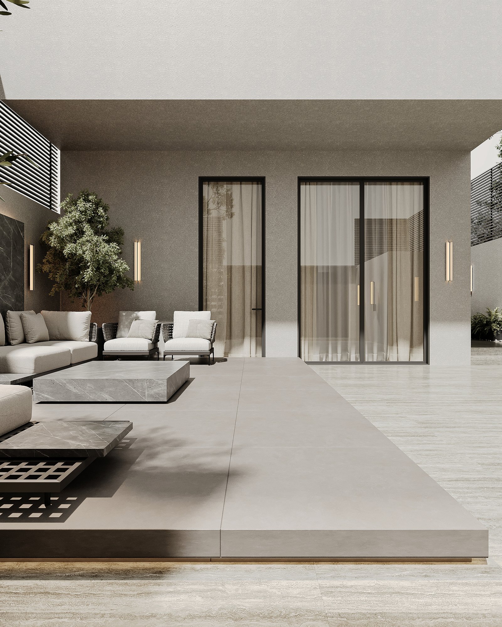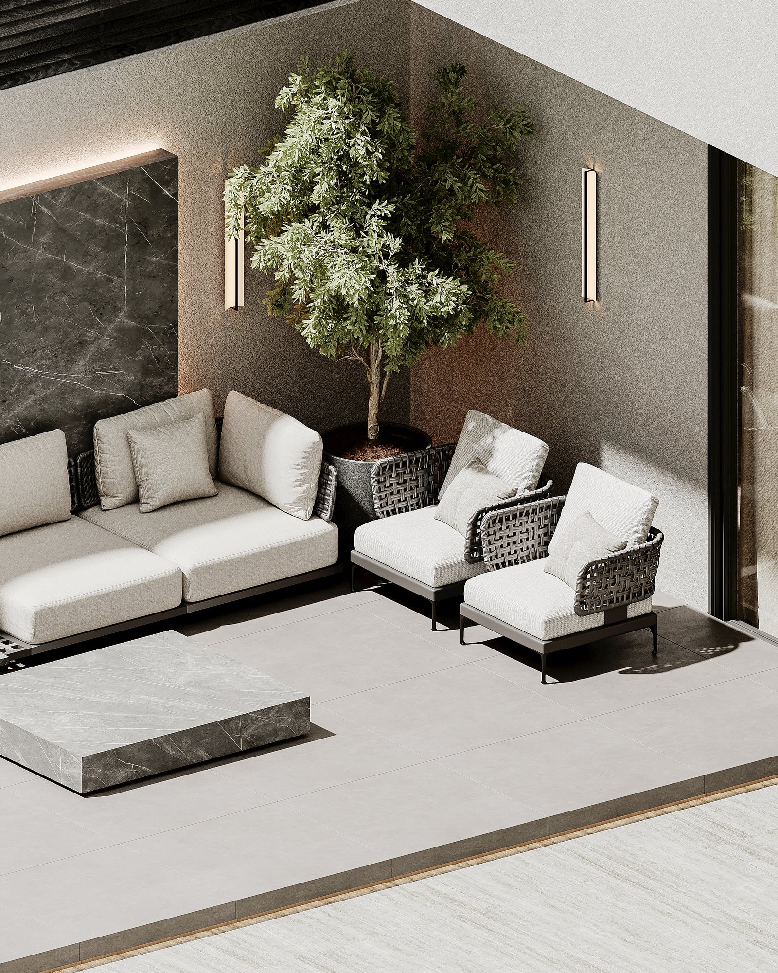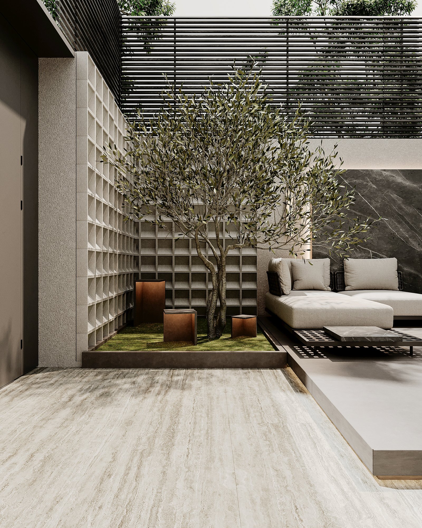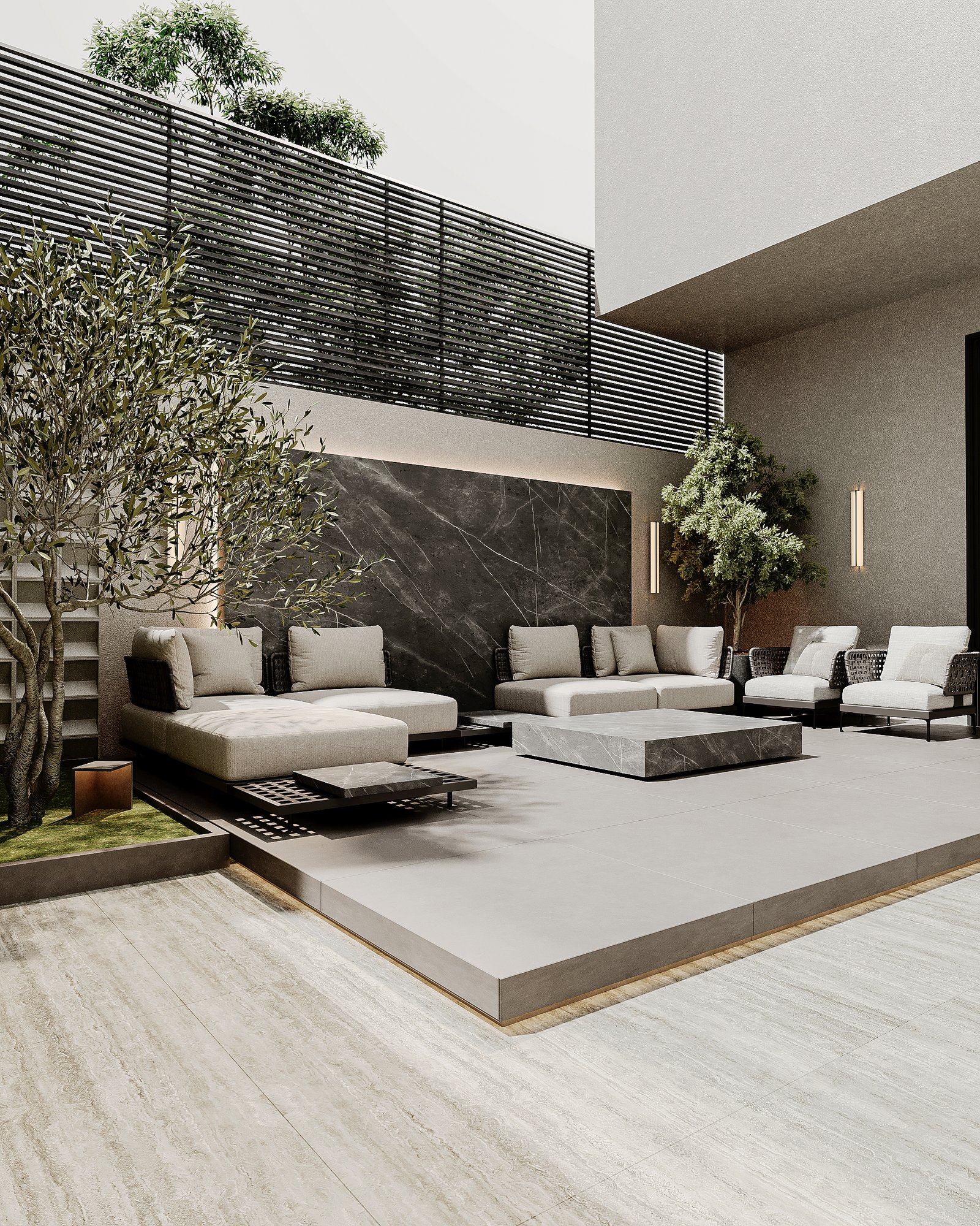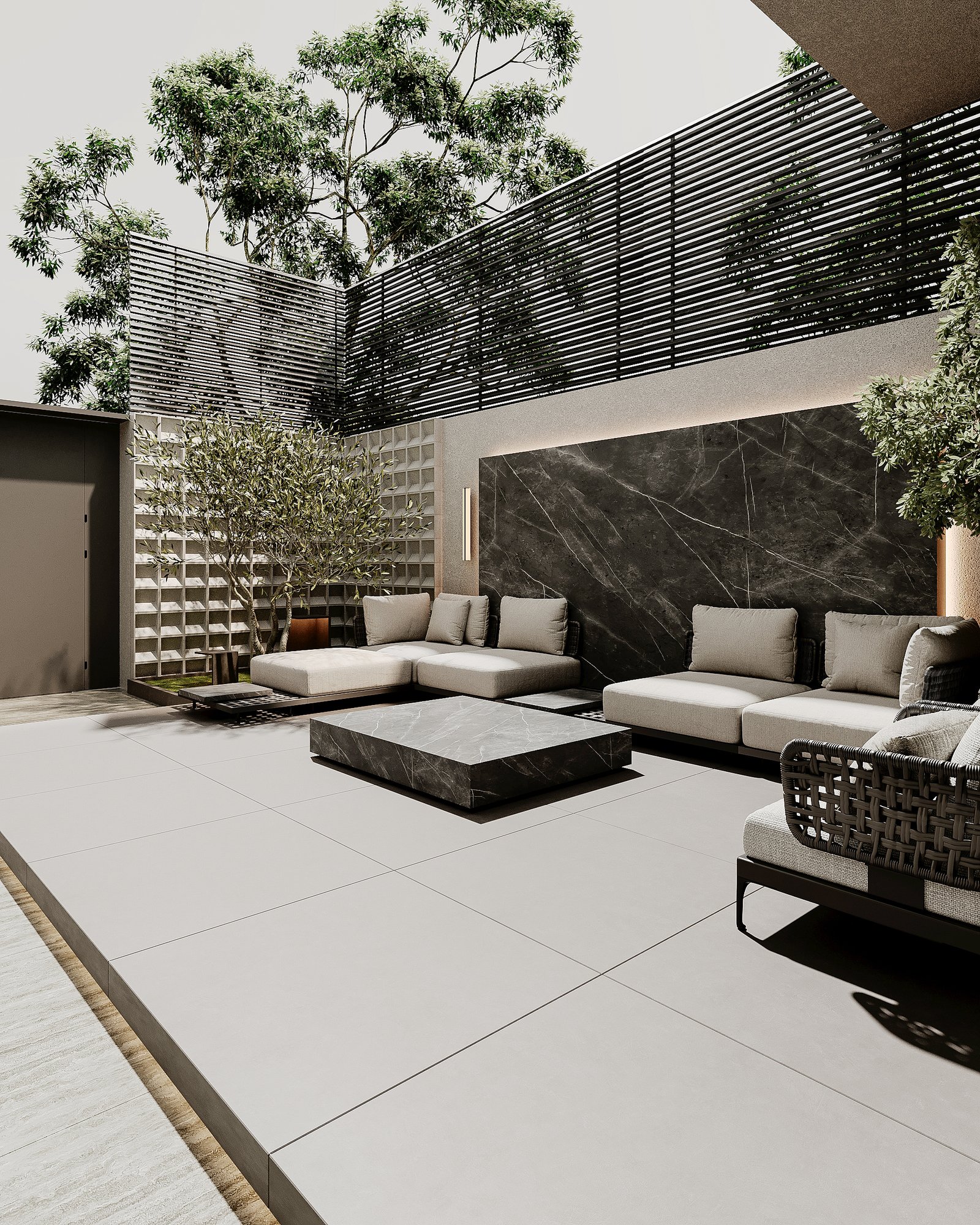 This luxurious outdoor lounge showcases a contemporary design with a striking black marble accent wall, complemented by warm ambient lighting. The spacious L-shaped sofa, upholstered in soft beige fabric, provides a comfortable and inviting seating area. A matching black marble coffee table sits at the center, enhancing the modern aesthetic. The flooring consists of large light-colored tiles, adding to the clean and elegant look. Lush greenery, including small trees and potted plants, softens the space, creating a serene atmosphere. A horizontal black metal privacy screen allows for airflow while maintaining seclusion, making this lounge perfect for relaxation and social gatherings.