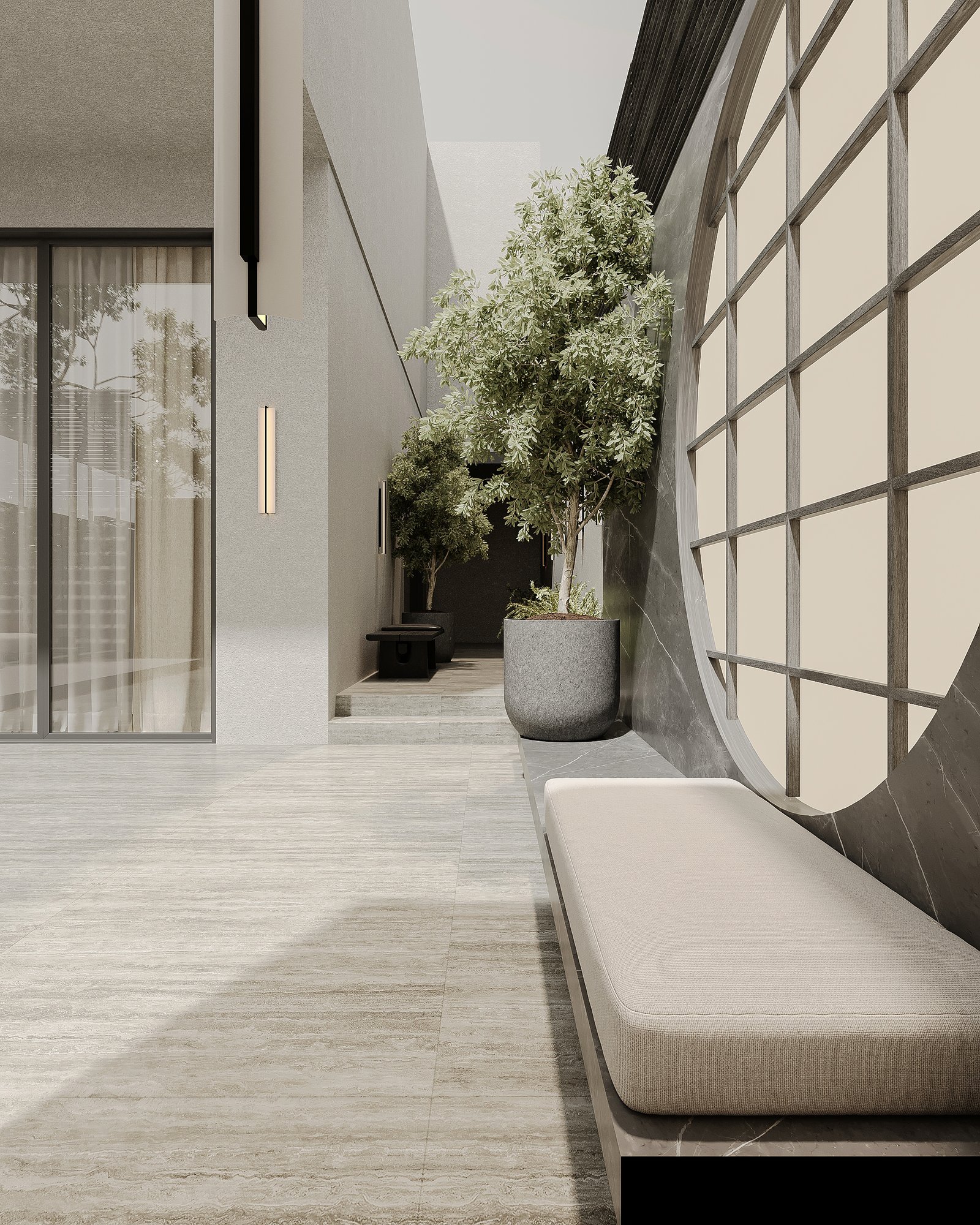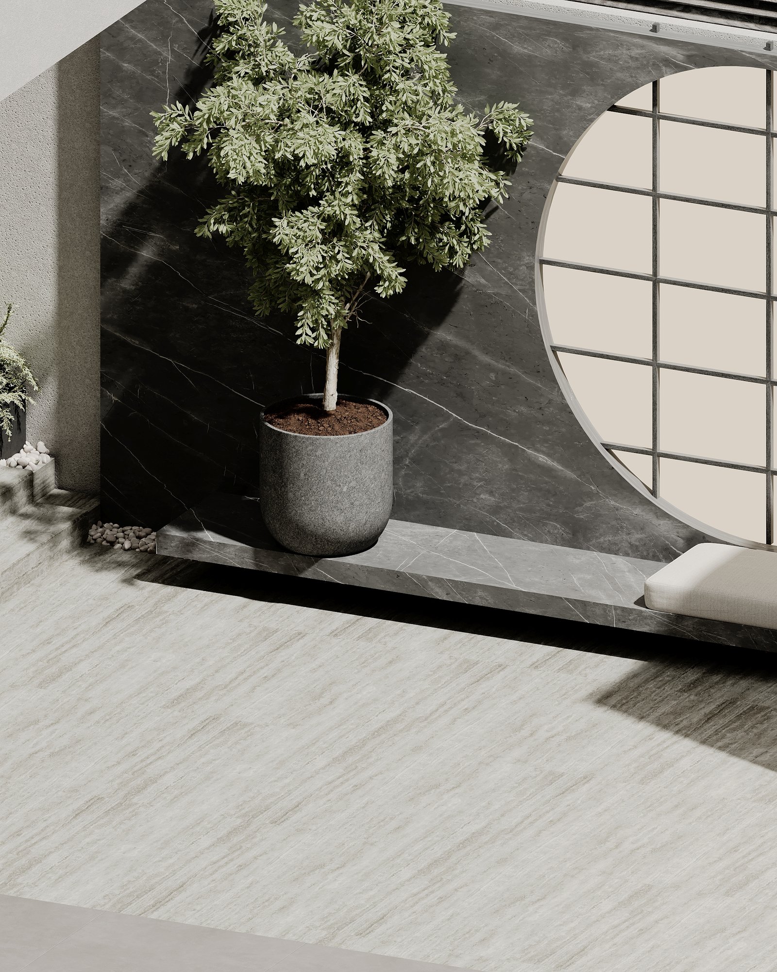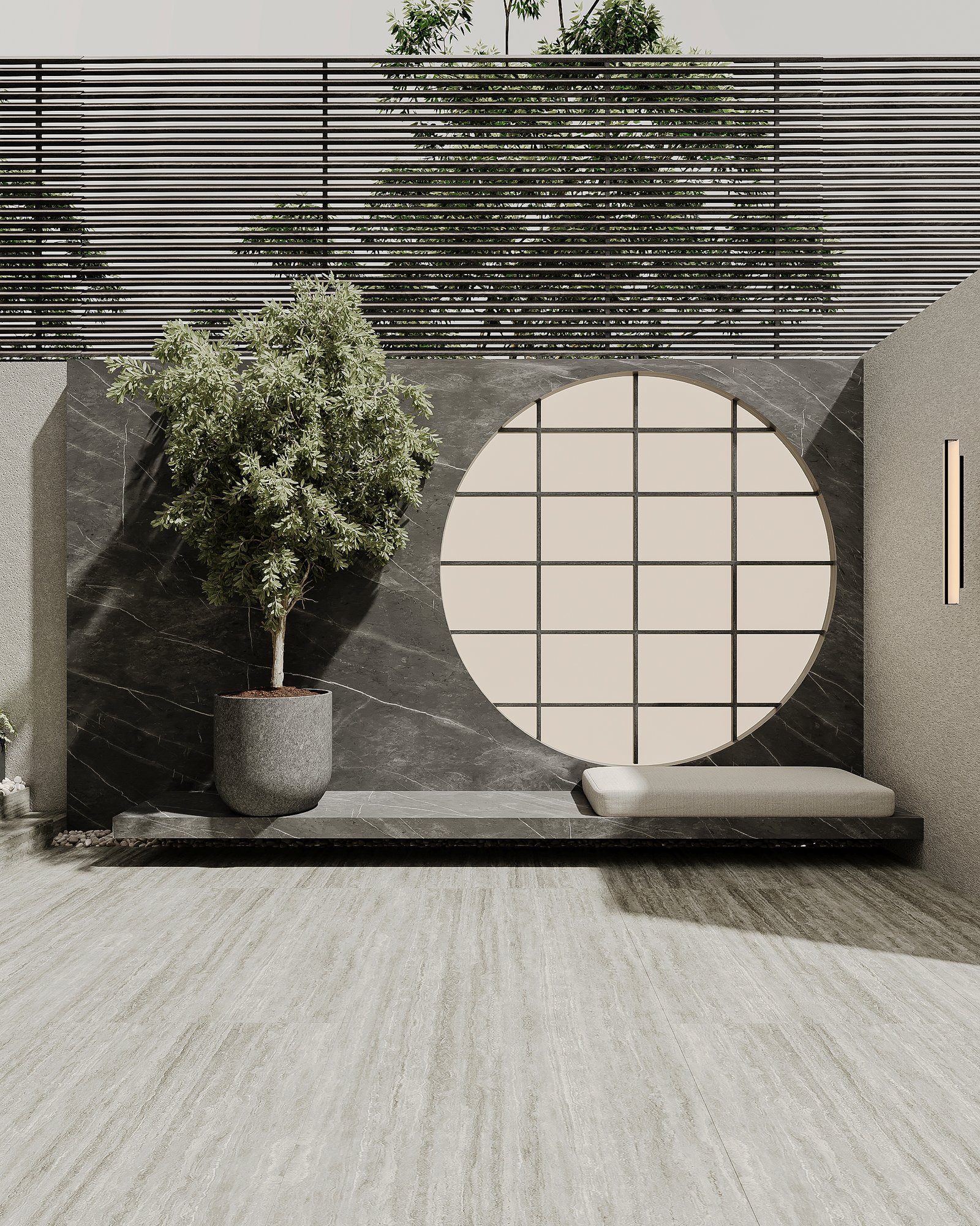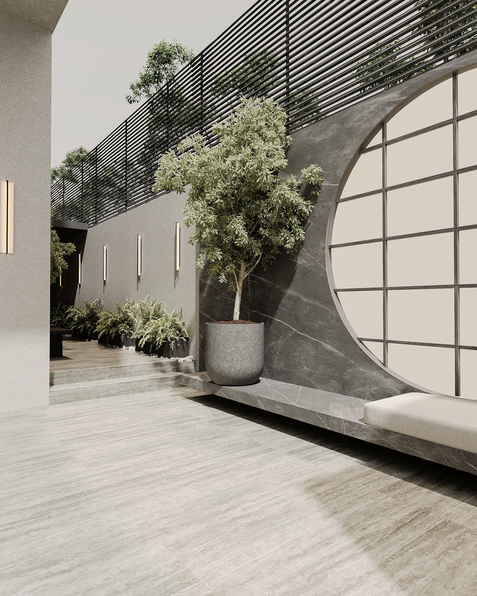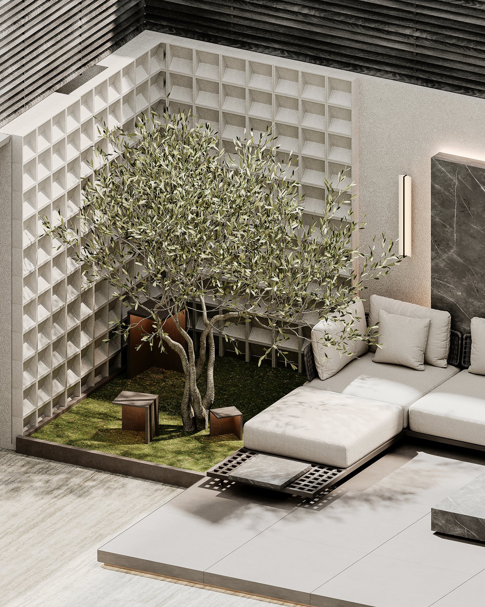 This luxurious outdoor lounge showcases a contemporary design with a striking black marble accent wall, complemented by warm ambient lighting. The spacious L-shaped sofa, upholstered in soft beige fabric, provides a comfortable and inviting seating area. A matching black marble coffee table sits at the center, enhancing the modern aesthetic. The flooring consists of large light-colored tiles, adding to the clean and elegant look. Lush greenery, including small trees and potted plants, softens the space, creating a serene atmosphere. A horizontal black metal privacy screen allows for airflow while maintaining seclusion, making this lounge perfect for relaxation and social gatherings.