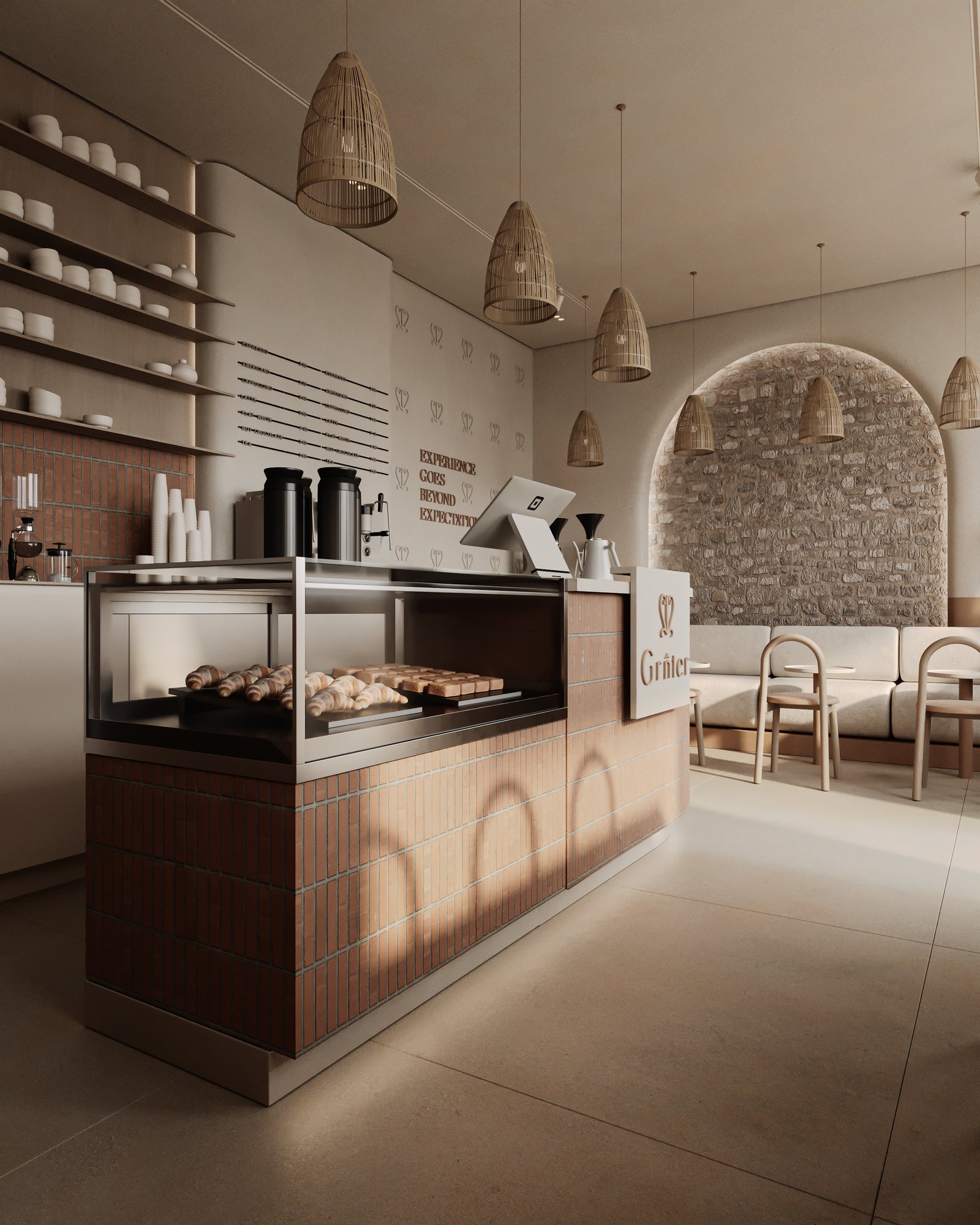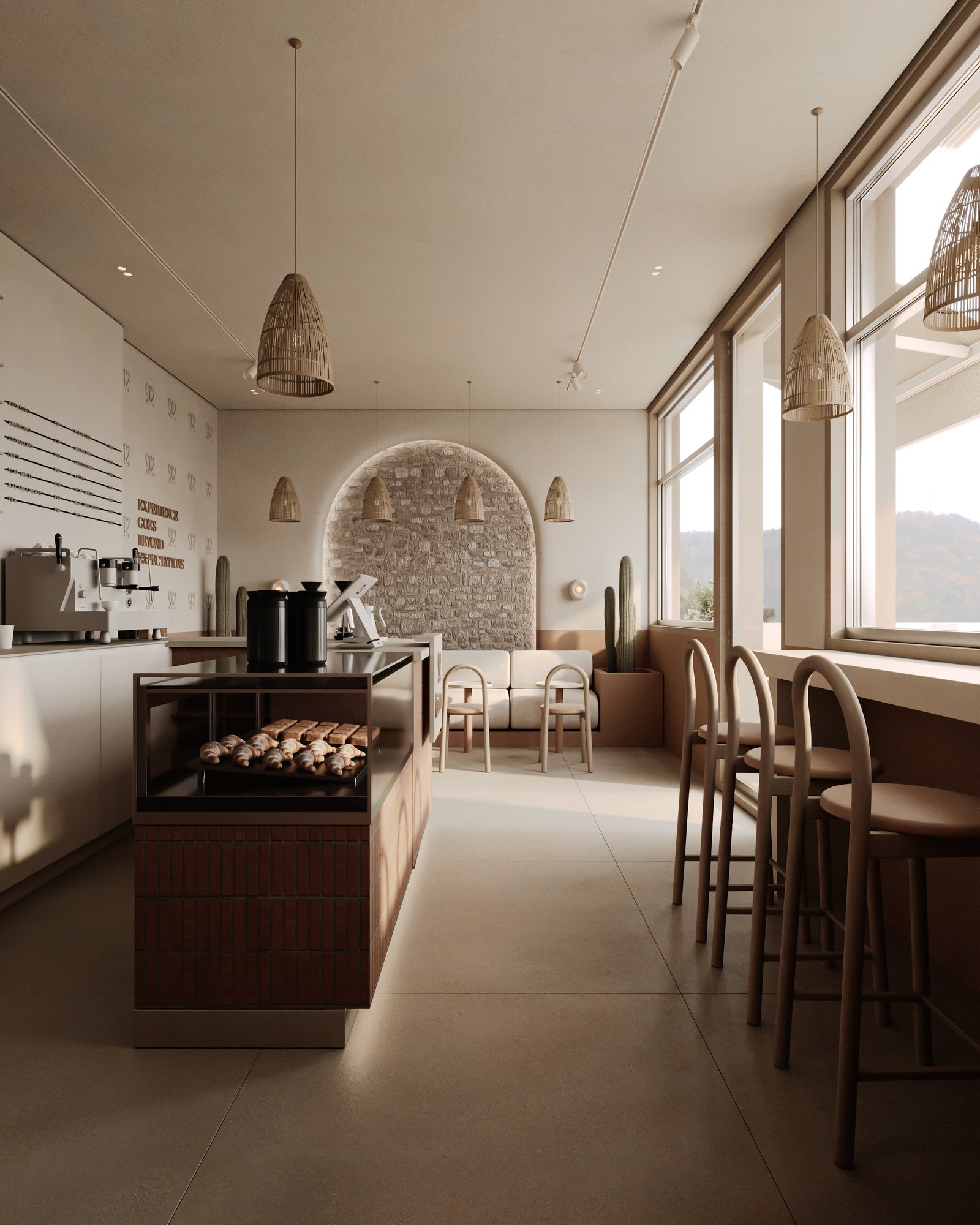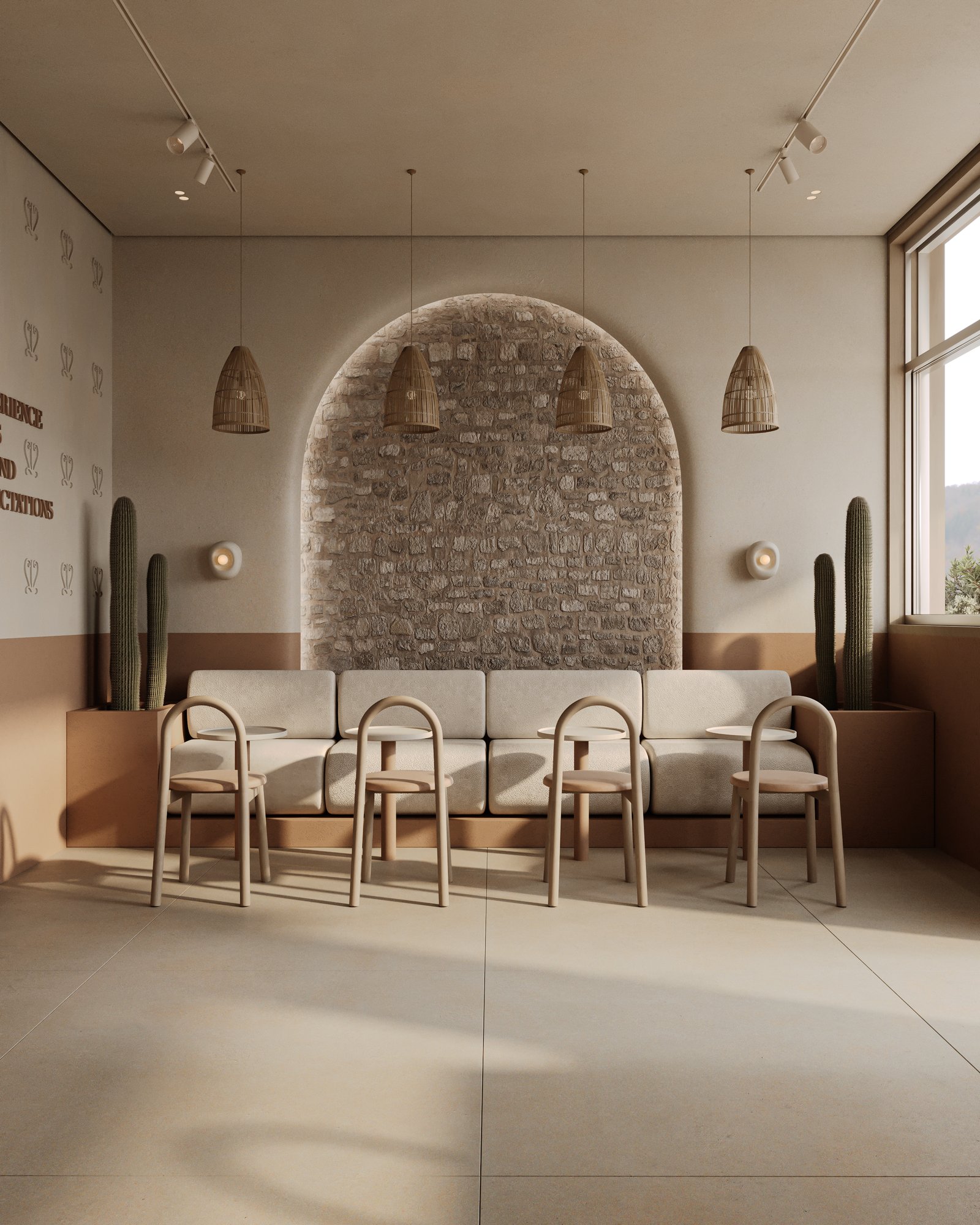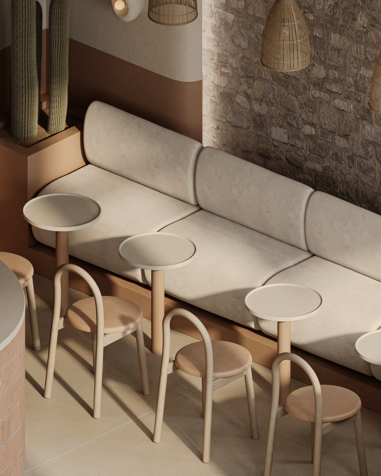 a cozy, minimalist café interior with a warm, earthy aesthetic. A beige cushioned bench runs along the stone-textured wall, paired with curved wooden chairs and small circular tables. The space features natural tones, including light wood and sand-colored elements. Woven basket-style pendant lights hang above, adding an organic touch, while potted cacti bring in greenery. Soft, natural light enhances the calm and inviting atmosphere.