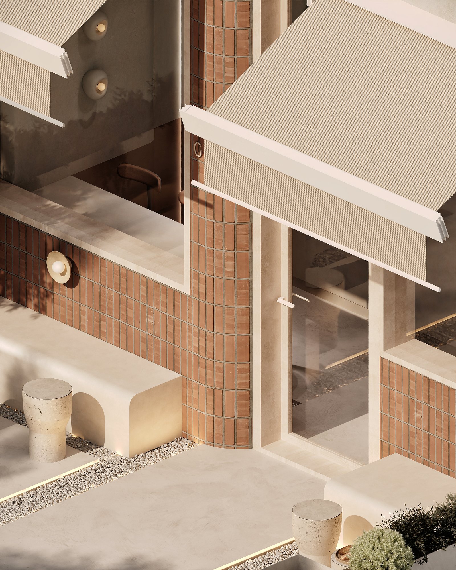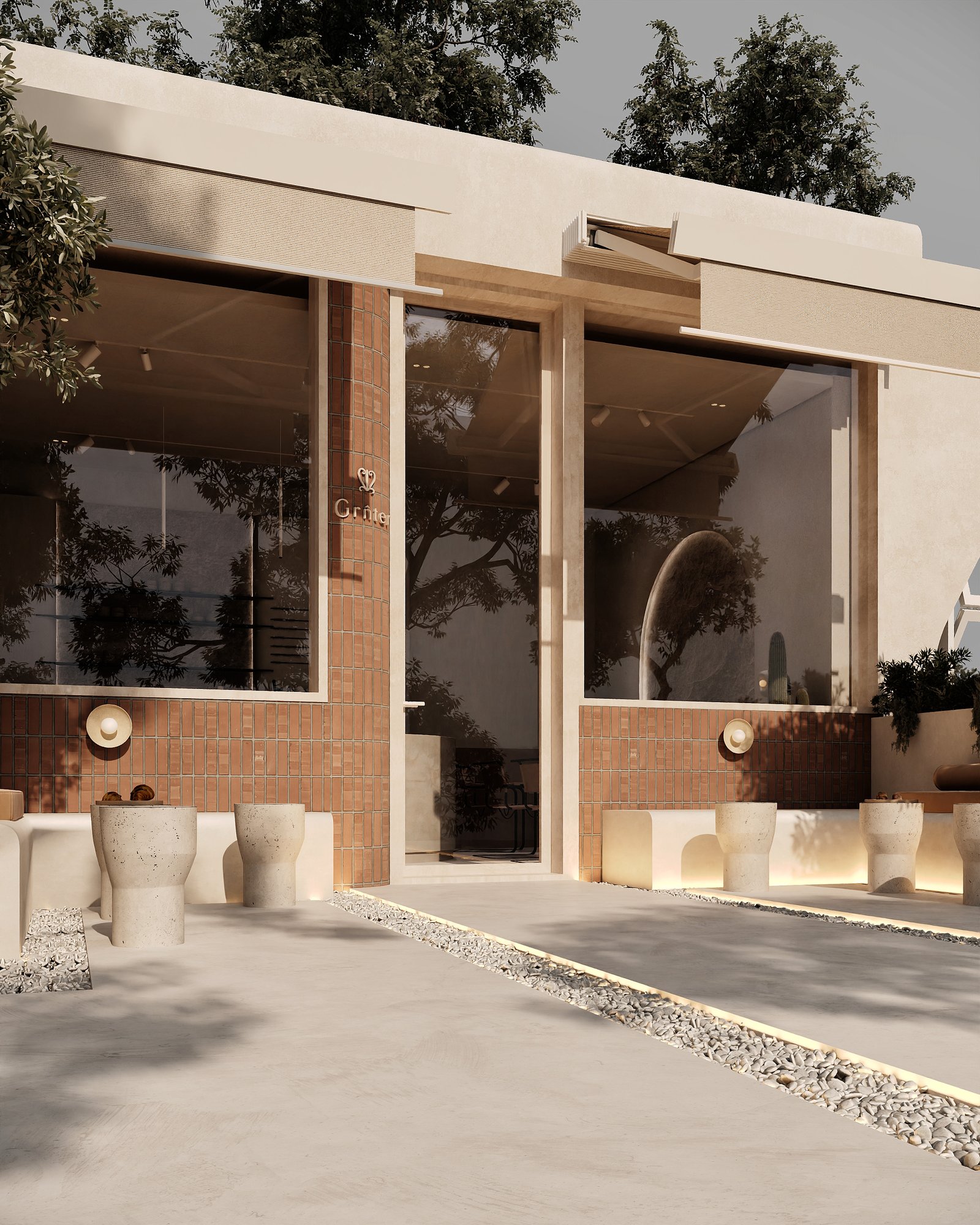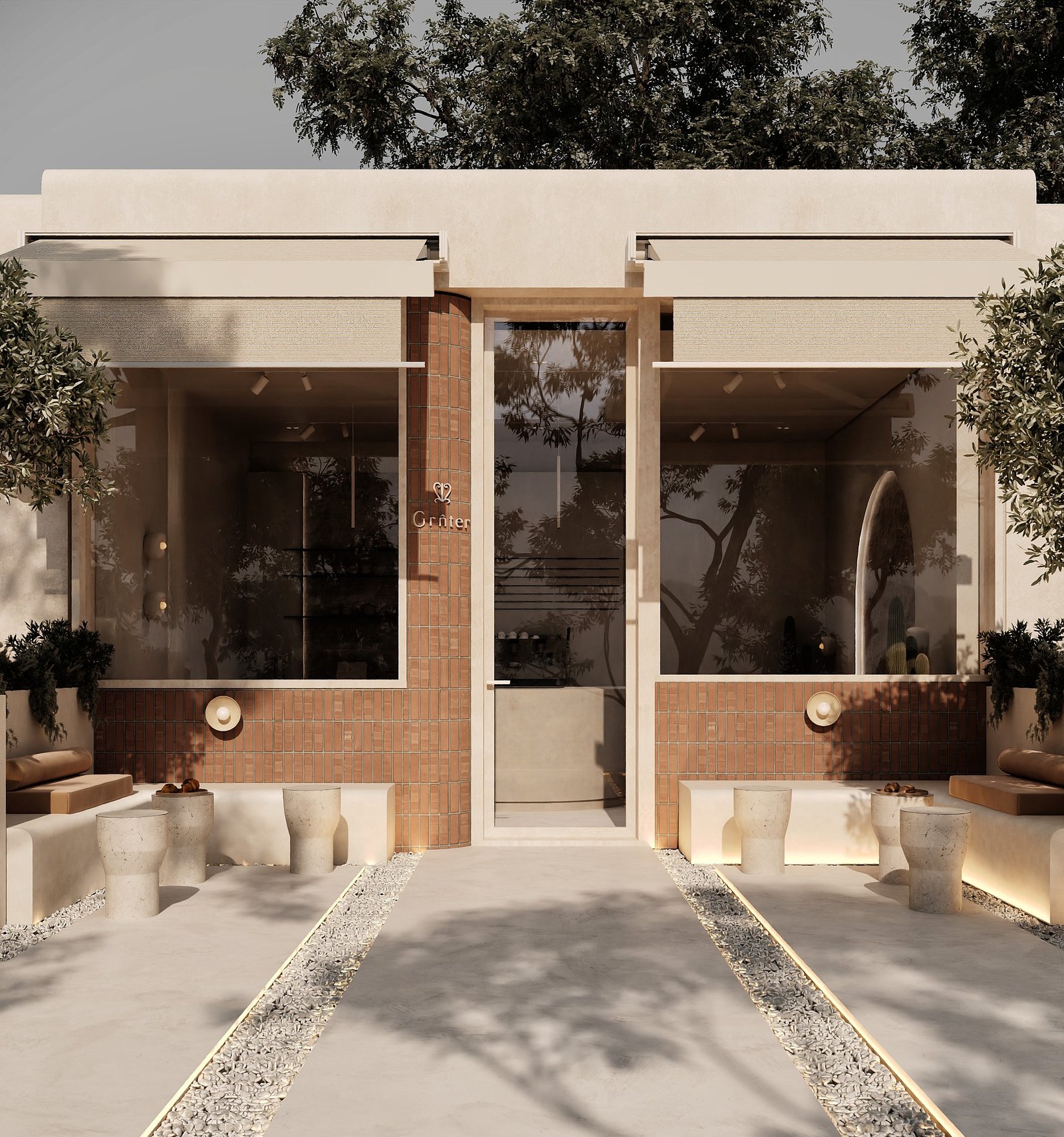 a cozy, minimalist café interior with a warm, earthy aesthetic. A beige cushioned bench runs along the stone-textured wall, paired with curved wooden chairs and small circular tables. The space features natural tones, including light wood and sand-colored elements. Woven basket-style pendant lights hang above, adding an organic touch, while potted cacti bring in greenery. Soft, natural light enhances the calm and inviting atmosphere.