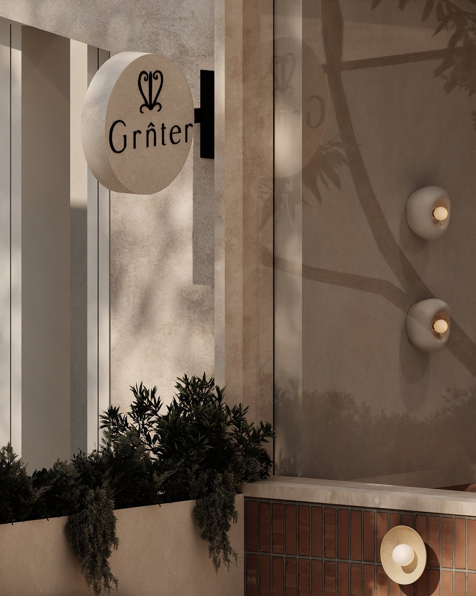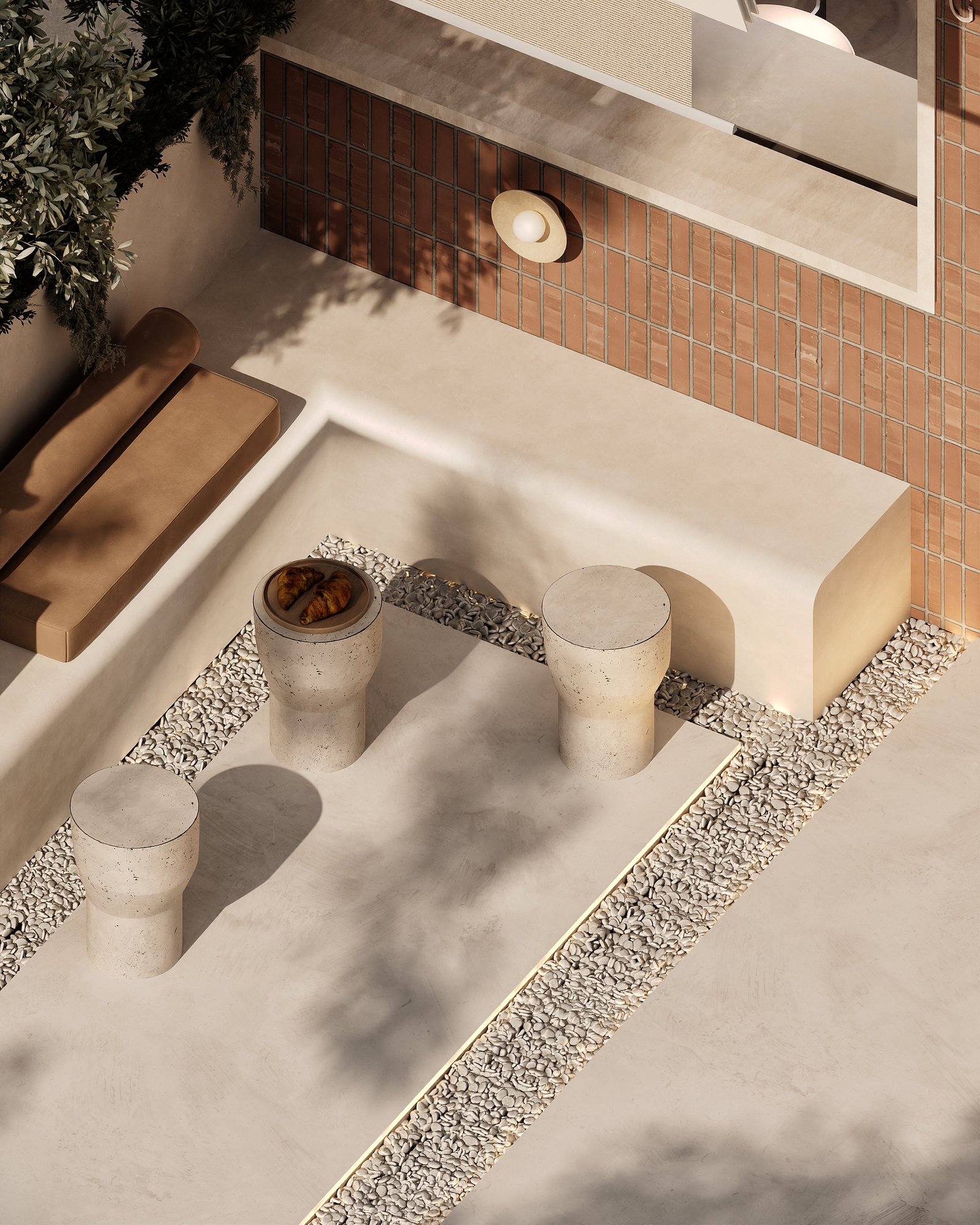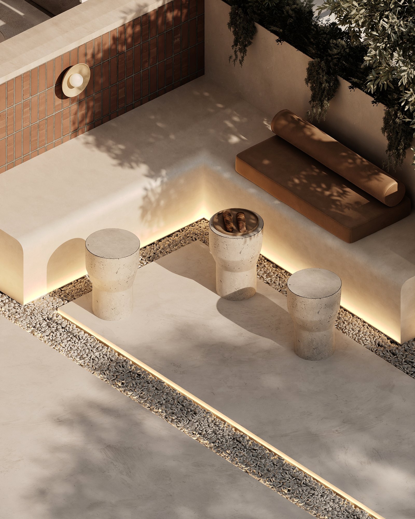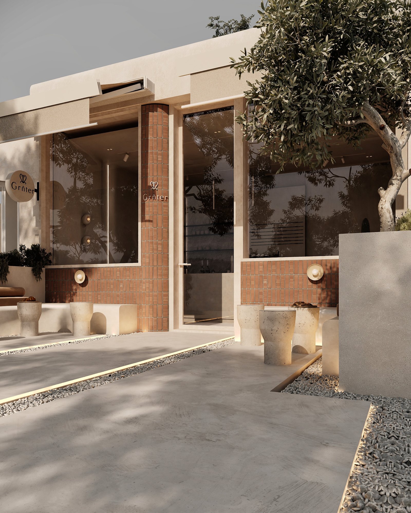 a cozy, minimalist café interior with a warm, earthy aesthetic. A beige cushioned bench runs along the stone-textured wall, paired with curved wooden chairs and small circular tables. The space features natural tones, including light wood and sand-colored elements. Woven basket-style pendant lights hang above, adding an organic touch, while potted cacti bring in greenery. Soft, natural light enhances the calm and inviting atmosphere.