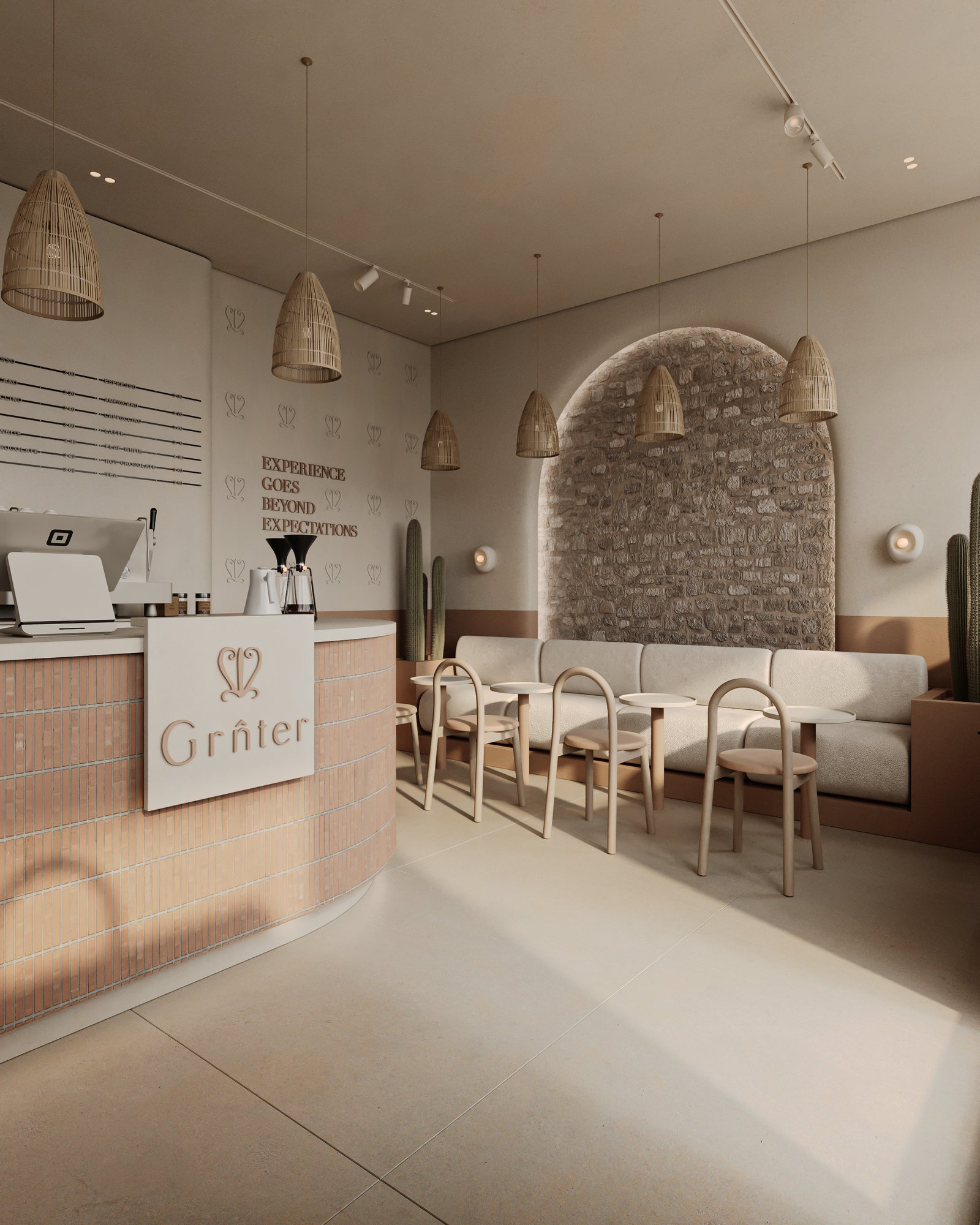 a cozy, minimalist café interior with a warm, earthy aesthetic. A beige cushioned bench runs along the stone-textured wall, paired with curved wooden chairs and small circular tables. The space features natural tones, including light wood and sand-colored elements. Woven basket-style pendant lights hang above, adding an organic touch, while potted cacti bring in greenery. Soft, natural light enhances the calm and inviting atmosphere.