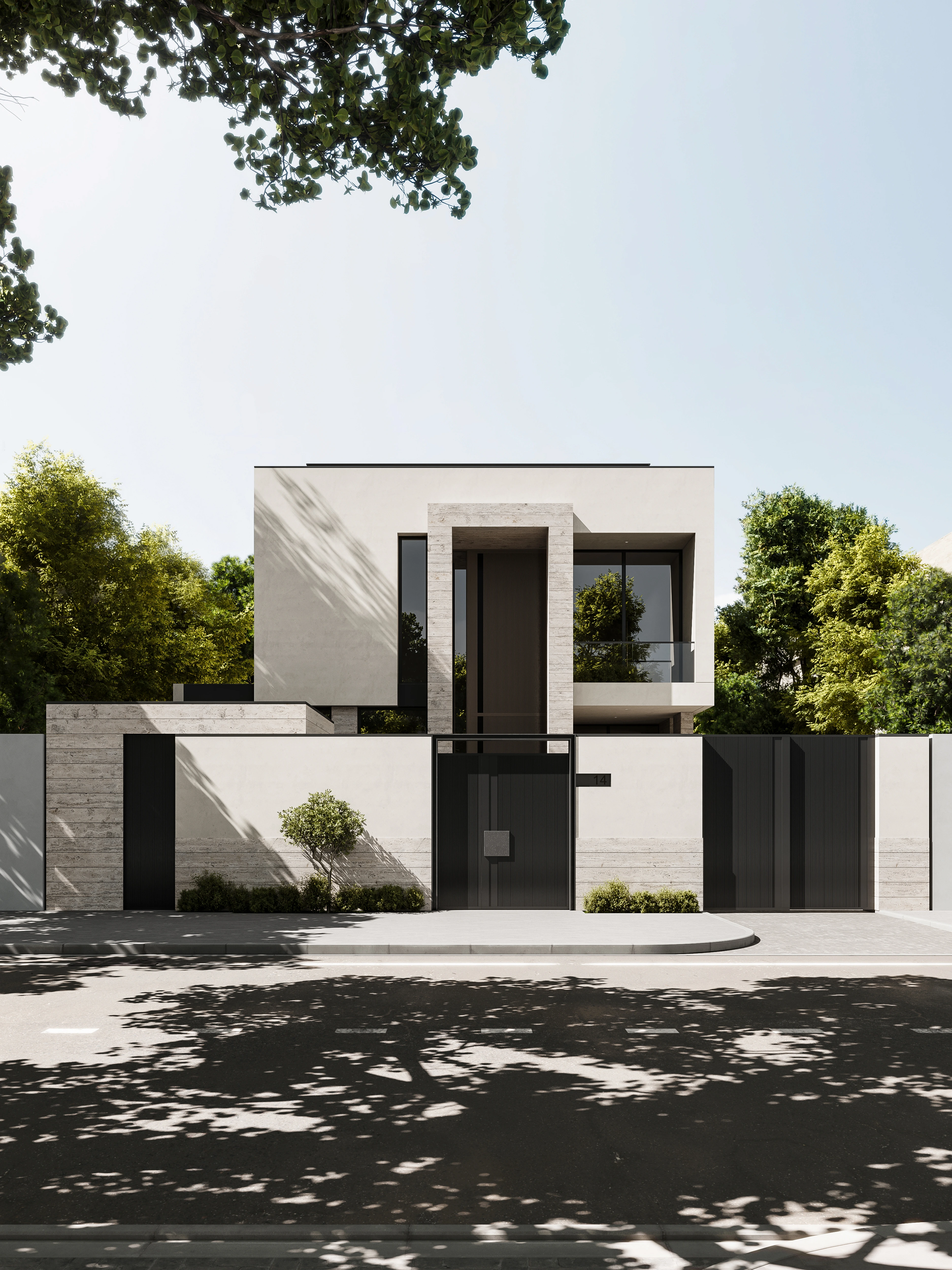 A modern minimalist villa with clean geometric lines, a neutral-toned facade, and a seamless blend of concrete and stone. The design emphasizes privacy while integrating natural light and lush greenery, creating a refined and harmonious architectural aesthetic.